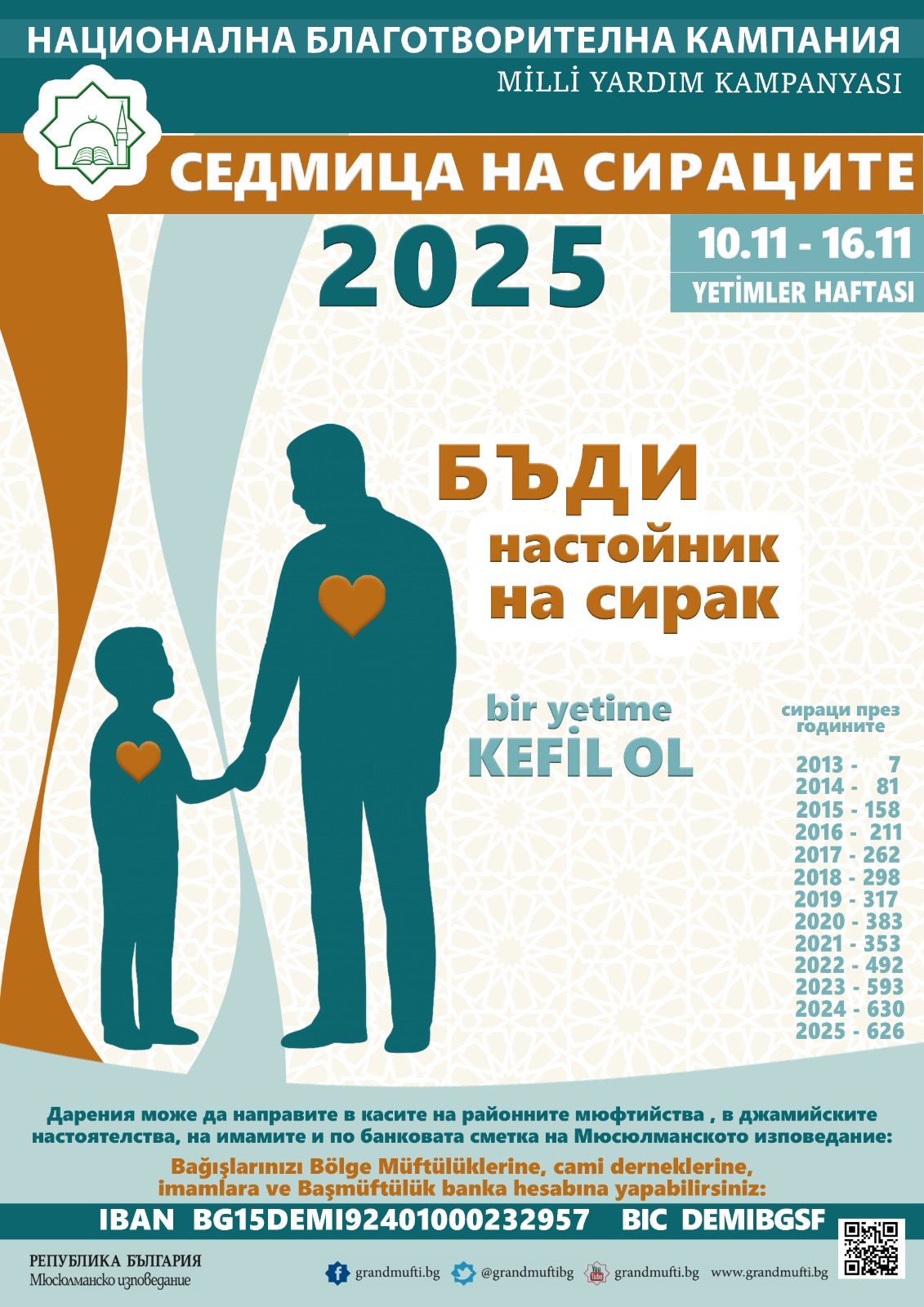 Към настоящия момент, с общите усилия на институцията и вярващите, Мюсюлманското изповедание подпомага 626 деца. Наред с финансовата помощ организираме и редица срещи с тях като израз и на моралната подкрепа, която могат да получат.