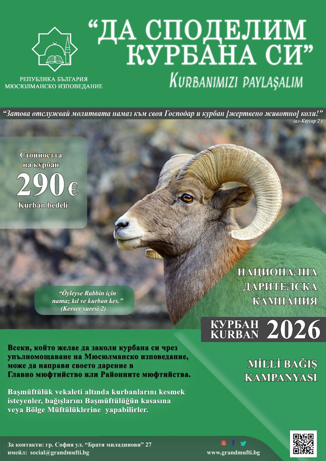 Bulgaristan Müslümanları Başmüftülüğü, vekâlet yoluyla yürütülecek Millî Kurban Kampanyası’nı kamuoyuna duyurmaktadır.