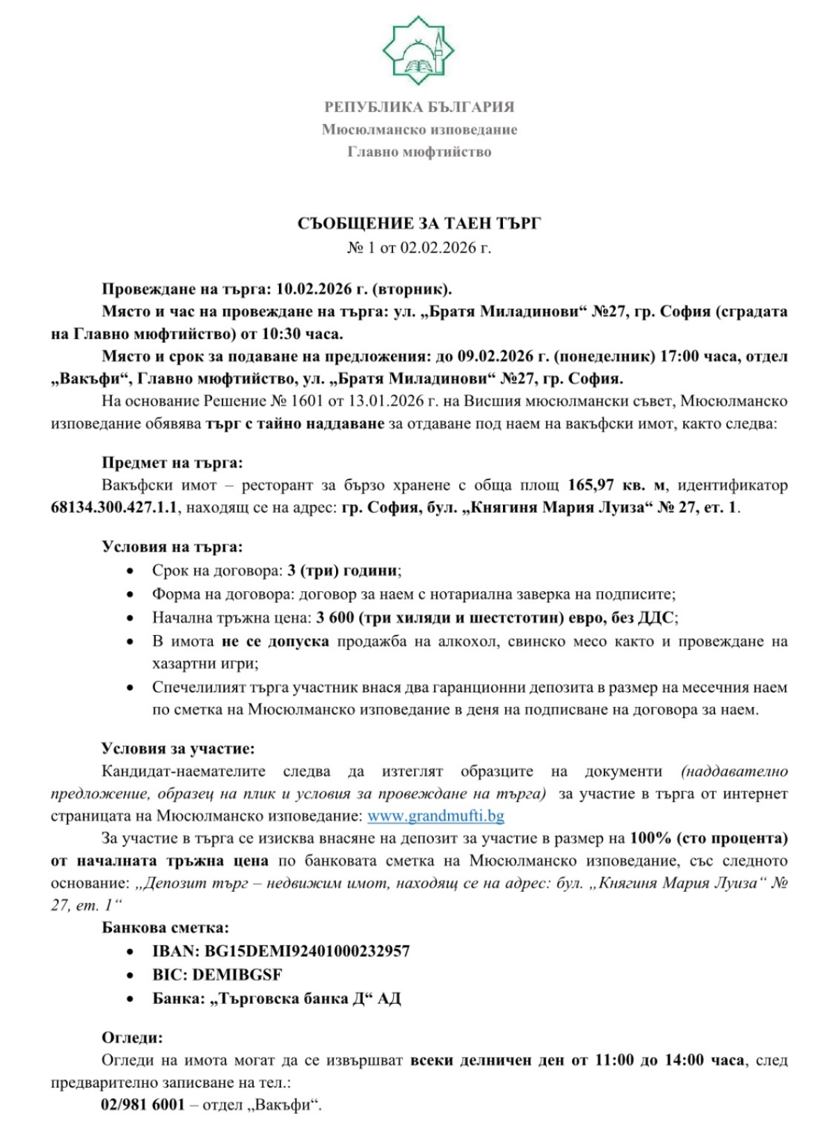 Фаилове за изтегляне:1. Условия за провеждане на търг2. ОБРАЗЕЦ НА ПЛИК И НАДДАВАТЕЛНО ПРЕДЛОЖЕНИЕ