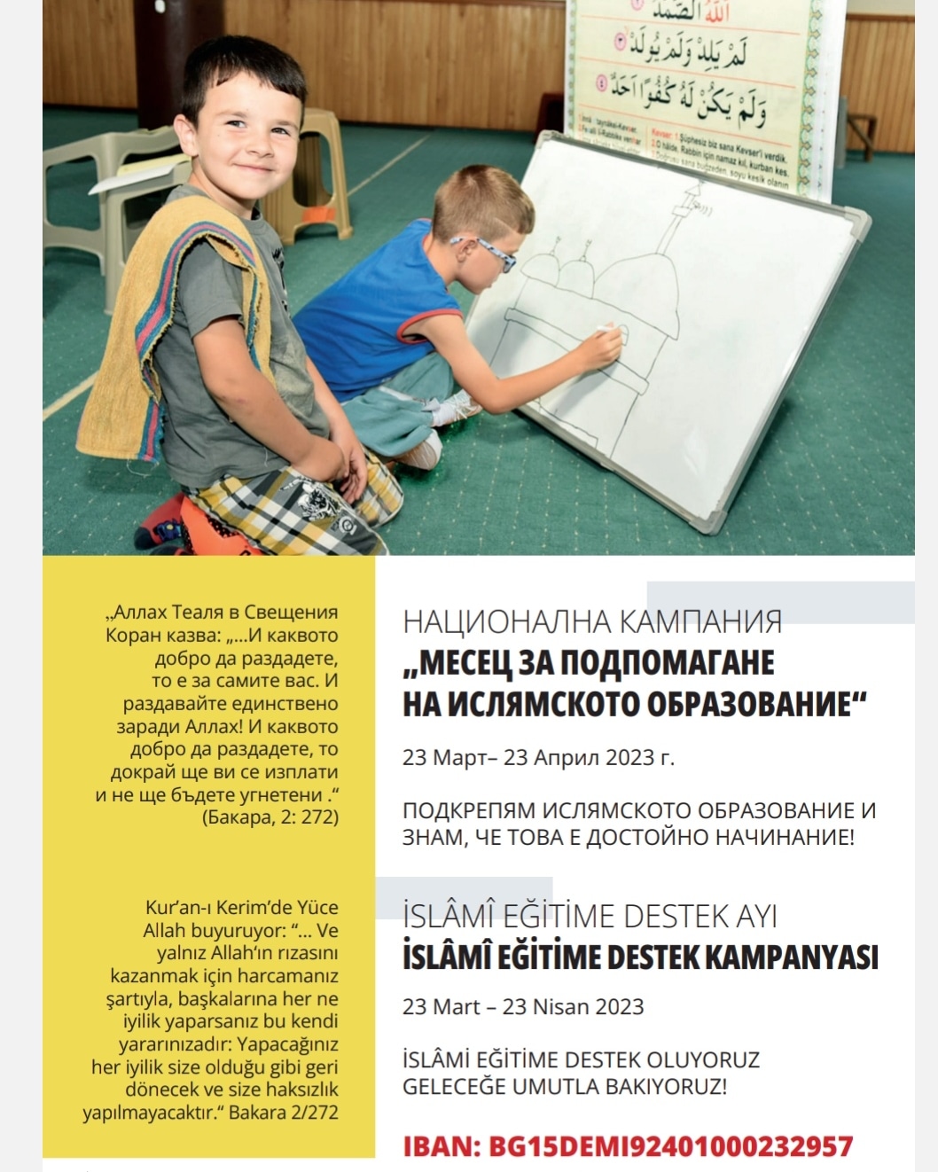 إن دعمكم ودعمنا لحملة التبرع الوطنية ينعكس بشكل أفضل في معرفة وتعليم أطفالنا. ومن خلال الجهود المشتركة، تجاوزت الأموال التي تم جمعها لدعم التعليم الديني في عام 2023 مبلغ 800000 ليف بلغاري، ومعهم قمنا مرة أخرى بزيادة عدد المجموعات والأطفال الذين يحضرون دورات القرآن الصيفية، ومكافأة معلميهم وتنظيم سلسلة من الدورات والندوات للطلاب. ، وكذلك الأمر بالنسبة للمعلمين.